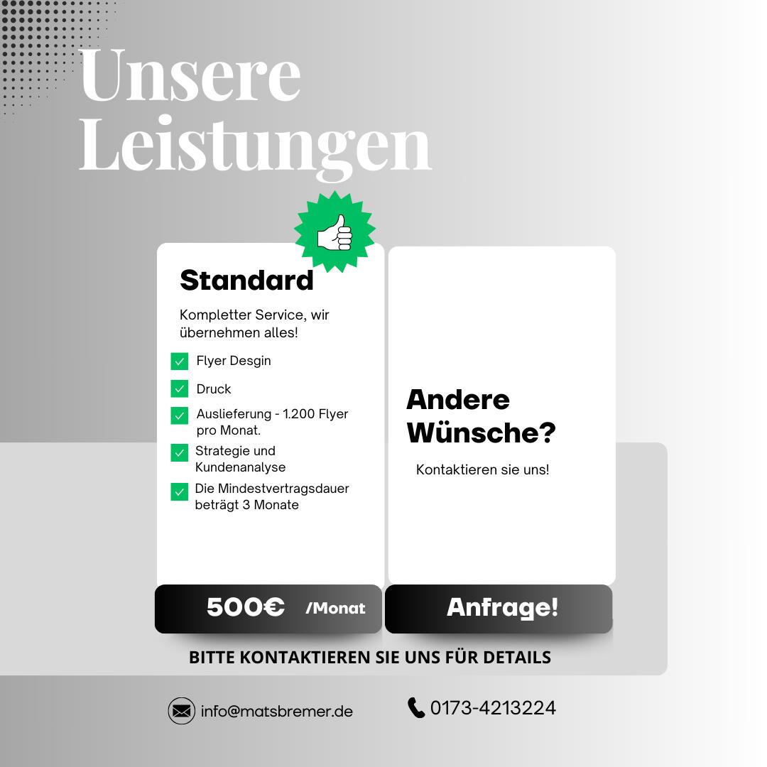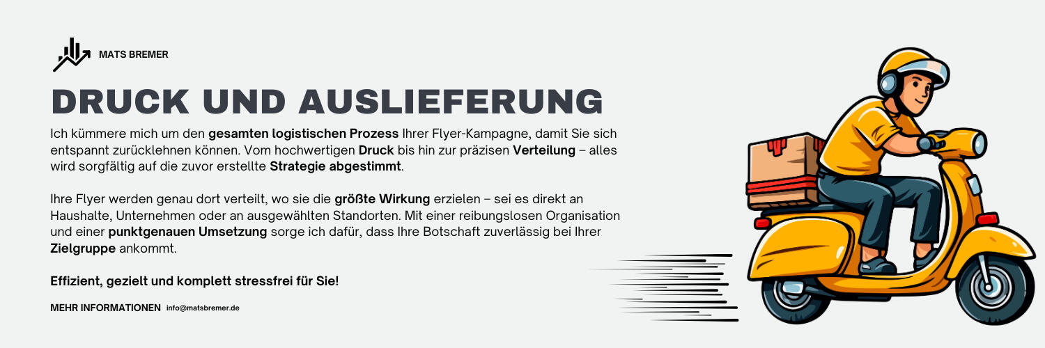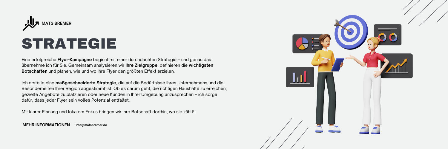 Mein Name ist Mats Bremer, und ich habe es mir zur Aufgabe gemacht, kleineren Unternehmen dabei zu helfen, in ihrer Region sichtbar zu werden. In einer Welt, die immer digitaler wird, glaube ich an die Kraft des guten alten Door-to-Door-Marketings – persönlich, greifbar und direkt.Mit meiner Spezialisierung auf Flyer-Marketing unterstütze ich lokale Betriebe, die Nähe zu ihren Kunden suchen. Ich kümmere mich um alles: von der Analyse potenzieller Zielgruppen über das Design bis hin zum Druck und der gezielten Verteilung. Mein Ziel ist es, Ihren Betrieb nicht nur bekannter zu machen, sondern auch echte Verbindungen zu schaffen – direkt vor der Haustür Ihrer Kunden.Gemeinsam bringen wir Ihre Botschaft an die richtigen Türen!